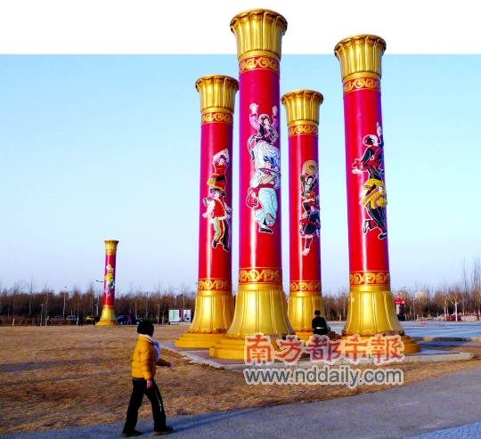 27日下午,記者在奧林匹克公園原祥云劇場位置看到,五根民族團結柱已經豎立起來,它們分別代表黎族、高山族、傈僳族、畬族和哈薩克族。五根柱子分別豎立在鋪設了25毫米厚鋼板的水泥墩上。