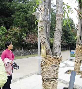 黃隊長介紹說,2008年的寒災過后,他們對綠化植物受到的損害做了調查、分析和總結,并制定出了一份植物冷害等級劃分的方案。針對今年的情況,黃旭光稱,他們根據氣象部門的中、長期天氣預報,并結合當年秋季及冬季的氣候條件,針對不同生態習性的植物采取了不同的御寒措施。如冷害來臨前給樹木灌水,保持地溫和樹溫;給易受害的苗木噴灑防凍劑;對一些高大的喬木,用草繩和塑料薄膜進行樹干包裹,或在樹干涂石硫合劑進行保護。對于在2008年寒災后補種的樹木,因為生命力還較弱,日常的護理工作將會做得更細致。
