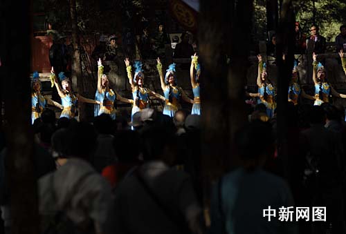 首屆昆明市花、云南山茶花節(jié)開(kāi)幕,市民舞蹈隊(duì)早早的在園區(qū)表演。 攝影:田洪