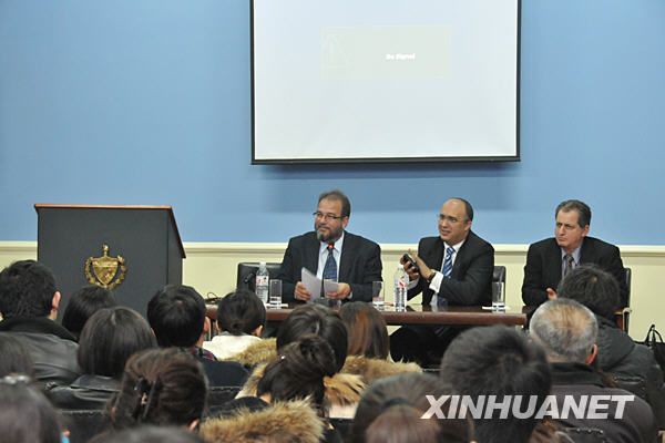 2月1日,古巴旅游部長馬努埃爾·馬雷羅·克魯斯(左一)在古巴駐華使館介紹古巴旅游業