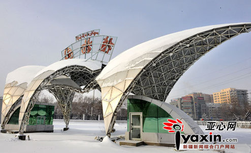記者在烏市植物園看到,一座金屬制成的巨大灰色風帆重疊造型大門已基本建成,但這座漂亮的大門卻被彩鋼板圍著,周圍約50平方米的土地上覆蓋著近30厘米厚的積雪。