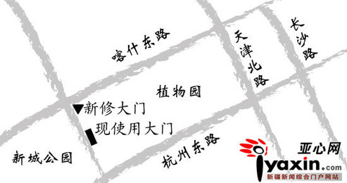 烏市植物園新修的大門位于喀什東路與北京路交會處,于2006年4月開始修建,至今已近4年,但現在仍被一排藍色彩鋼板包圍著。