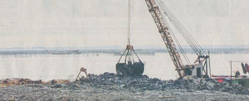 陽(yáng)澄湖美人腿正在用“清理上岸”的湖底淤泥修復(fù)湖岸線。 記者 濮建明 攝