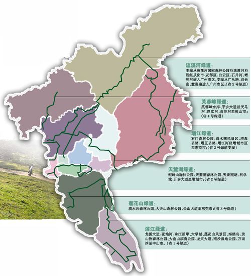 6條綠道主干線分別為流溪河綠道、芙蓉嶂綠道、增江綠道、天麓湖綠道、蓮花山綠道、濱江綠道。6條綠道主干線縱橫廣州12區(qū)(市),其中流溪河綠道主線從流溪河國家森林公園沿流溪河沿線經(jīng)從化市、花都區(qū)、白云區(qū)、石井河、增埗河進入廣州市區(qū),支線從廣從路、白云山、麓湖路進入廣州市區(qū),橫跨長度最長。