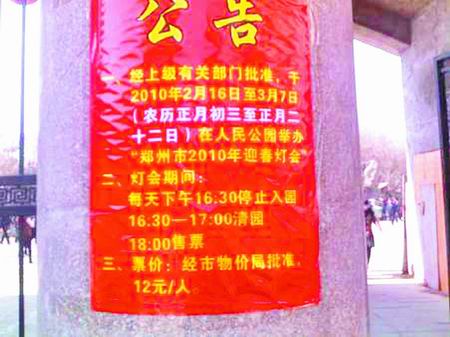 春節這些天,記者接連接到不少群眾對此事的反映。而記者在鄭州市人民公園門口發現一張醒目的公告(如上圖),公告稱:農歷正月初三至正月二十二,在人民公園舉辦2010年迎春燈會。燈會期間每天下午4時30分停止入園,4時30分至5時清園。門票價格12元。