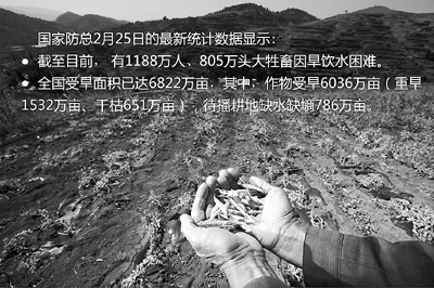 國家防總2月25日的最新統計數據顯示,截至目前,有1188萬人、805萬頭大牲畜因旱飲水困難,分別比多年同期均值多424萬人、311萬頭,主要分布在云南、內蒙古、河北、甘肅、遼寧、貴州、山西、四川、廣西及重慶等省(區、市)的偏遠山丘區。