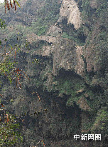 3月28日,馬嶺河大峽谷內的“七彩瀑布”受干旱影響斷流,露出鈣化群,其表面的青苔也全部枯死。攝影:曹多然
