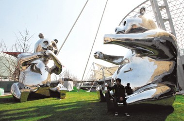 圖為3月28日在上海世博園區拍攝的大型熊貓雕塑。