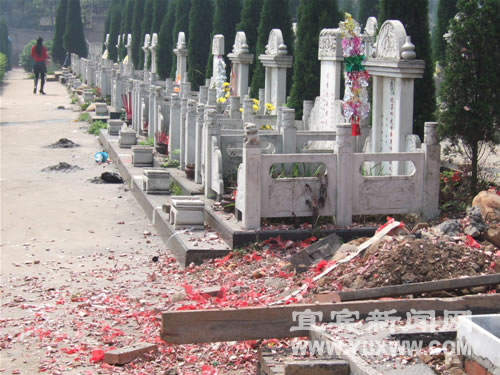 然而,人們還是習(xí)慣用傳統(tǒng)的祭掃方式。在墓地經(jīng)常見(jiàn)到的是:滿坡的“寶蓋”等傳統(tǒng)紙質(zhì)祭祀用品幾乎將墓園“染”成了白色,園內(nèi)鮮有花籃等時(shí)尚祭祀用品。盡管在園中有指定的爆燃放點(diǎn),但在一些墓碑前,仍能見(jiàn)到爆竹燃放后留下的紙屑。