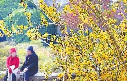 4月4日,在鄭州市的一個公園內(nèi),兩位老人坐在迎春花前的石階上聊天。清明時節(jié),春意盎然,人們紛紛駐足賞春。   新華社發(fā)