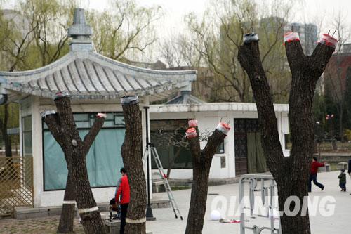 每年的四五月,是京城漫天飛絮的季節(jié)。北京市園林綠化局從2003年開始,通過噴藥、打針等形式,對人多密集的城區(qū)部分的柳樹進行了治理,在一定程度上抑制了飛絮對百姓出行的影響。經(jīng)過反復篩選、試驗、評價,在柳樹上目前主要采用柳樹的“高接換頭”技術(shù)控制飛絮。這些技術(shù)已在公園(重點為柳蔭公園與青年湖公園)、昌平區(qū)等重點區(qū)域推廣應用。目前,采用高位嫁接方法,使柳樹雌株變?yōu)樾壑辏卫盹w絮的柳樹已達550(包括柳蔭公園220株、青年湖公園180株、安華西里100株、昌平大街50株)余株,取得了區(qū)域性良好的示范效果。