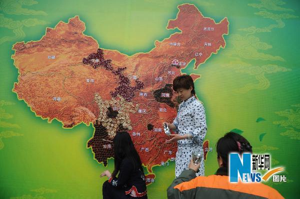 4月19日,北京八大處公園開始制作“茶地圖”,在20平方米的“茶地圖”上,工作人員根據中國產茶地區分布情況貼上其相應的茶。“茶地圖”將在4月27日開幕的八大處公園第九屆中國園林茶文化節上正式亮相,旨在普及茶文化知識。新華社記者 李俊東攝