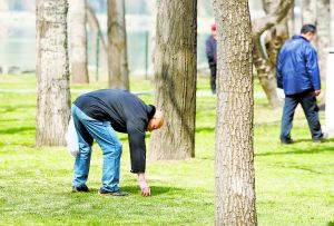 春暖花開、萬物復蘇,在頤和園等公園內,有些游人在剛泛綠的地上亂挖野菜。園林部門提醒市民:不是所有野菜都可食用,誤食可能發生危險,而且挖野菜也容易造成水土流失。 記者 李繼輝攝