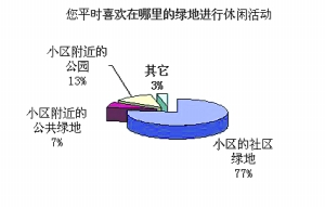 另外,小區園林與業主日常生活密切相關,平時的休閑生活在哪里進行?77%的網友選擇在小區的綠地進行休閑活動,而7%的網友選擇在小區附近的綠地,13%的網友選擇在附近的公園進行休閑活動。
