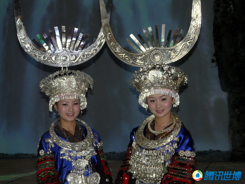 2010年4月29日,上海,世博會貴州館內身著銀飾的苗族姑娘。
