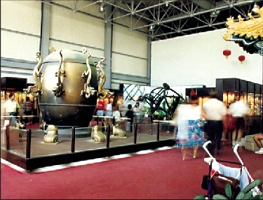 這三條線的所有展品,是被典型的中國皇家園林貫穿起來。展廳中央有一人工小湖,兩片池水由一羅鍋橋相隔。湖畔石筍、太湖石嶙峋,修郁郁蔥蔥。周圍是長廊、水榭,小橋旁有一個金碧輝煌的琉璃八角亭。