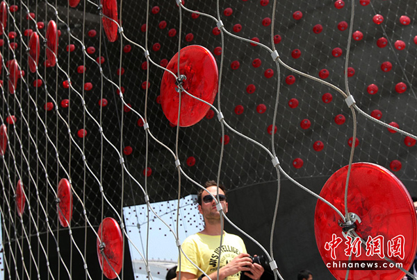 5月2日,上海世博會(huì)是第一個(gè)正式提出“低碳世博”理念的世博會(huì),圍繞著這樣的理念,上海世博園區(qū)內(nèi)的低碳元素比比皆是。圖為瑞士館用大豆纖維制成的紅色幕帷,能發(fā)電,可天然降解。中新社發(fā) 湯彥俊 攝