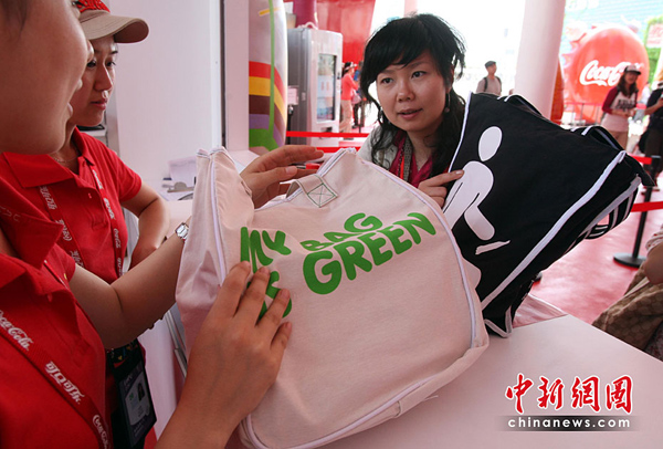 5月2日,上海世博會是第一個正式提出“低碳世博”理念的世博會,圍繞著這樣的理念,上海世博園區內的低碳元素比比皆是。圖為由回收的可樂瓶制成的環保包。中新社發 湯彥俊 攝
