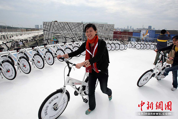 5月2日,上海世博會是第一個正式提出“低碳世博”理念的世博會,圍繞著這樣的理念,上海世博園區(qū)內(nèi)的低碳元素比比皆是。圖為游客在丹麥館內(nèi)享受自行車帶來的樂趣。中新社發(fā) 湯彥俊 攝