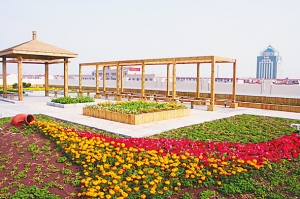 記者在大港第二小學新建的教學樓天臺看到,近1000平方米的花園里,既有亭臺又有植被,各種各樣的花卉爭奇斗艷。該工程相關工作人員告訴記者,這個空中花園的兩個花架和一個亭子都是用防腐料制成的。整個花園面積900多平方米,其中有100平方米的月季池、200多平方米的種植地、80平方米的花卉和一些硬化鋪裝設施。花園的花卉和植被共有20多個品種,都是經過工作人員挑選的抗旱性能強、管理簡便的觀賞植物。在栽種花卉之前,樓頂已經進行了特殊的處理,設置了三層防滲、防水設施,還加入了防止植物根莖破壞樓體的特殊材料。
