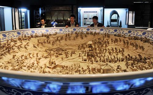 4月19日,參觀者在觀看重現明清時期農業生產場景的泥塑作品。新華社記者 朱崢 攝