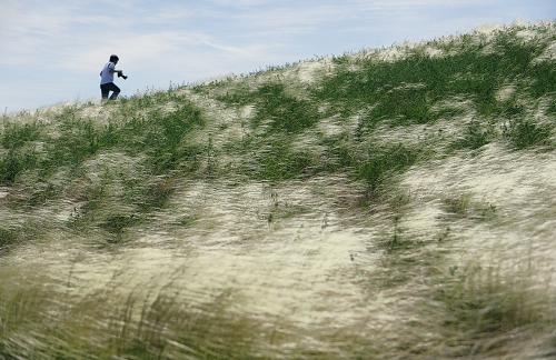 5月31日,一名攝影愛(ài)好者走在神木縣長(zhǎng)滿野草的山坡上。