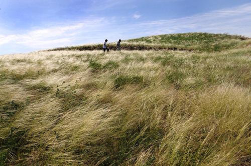 5月31日,兩個(gè)人走在神木縣長(zhǎng)滿野草的山坡上。新華社記者 陶明 攝
