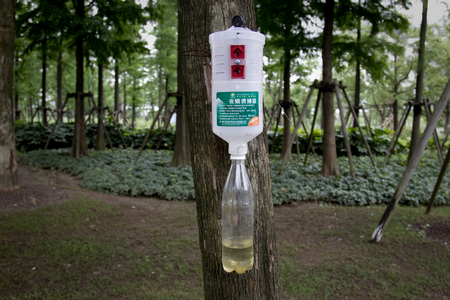 細心的游客可能會發現,園區的一些樹干上裝著一個個瓶狀的裝置,這就是世博園區中用到的夜蛾誘捕器。在誘捕器中,裝著一根長度8厘米左右,直徑約1毫米的紅色誘捕芯。可別小看這根“小紅線”,它能向雄性夜蛾散發出一種虛假的雌性夜蛾性信息,使雄性夜蛾以為前方有著雌性夜蛾,飛入誘捕器的小孔中試圖與之交配。