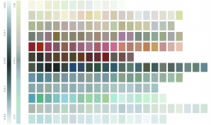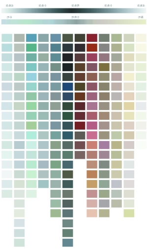 點(diǎn)綴構(gòu)件色彩規(guī)劃總譜包括灰綠色系、灰藍(lán)色系、無彩色系、黃褐色系和灰赭紅系,共5個(gè)色系。