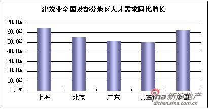 2009年我國經(jīng)濟恢復(fù)較快,為2010年的發(fā)展奠定了良好基礎(chǔ),所以今年上半年的人才需求增長并不是特別明顯,下半年部分城市人才需求將會呈現(xiàn)“井噴”狀態(tài)。據(jù)建筑英才網(wǎng)數(shù)據(jù)顯示,建筑業(yè)上半年全國范圍內(nèi)人才需求同比增長61%,其中以一線城市人才需求最大,長三角區(qū)的人才需求增長最快。一線城市人才需求量最大的城市為上海,同比增長64.4%,其次是北京、廣東地區(qū),同比增長55.1%和51.3%。截至6月底,長三角地區(qū)二線城市蘇州、杭州、南京、寧波等城市人才需求同比增長50%,諸多新項目的上馬帶來了人才供不應(yīng)求的局面。