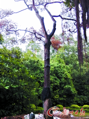 記者昨日從黃花崗公園獲悉,經過來自華南農業大學、廣東省林業科學研究院、廣州市園林科學研究所的專家和學者的會診,確定黃花崗公園百歲“病松”的致病原因是由于已屆高齡和氣候影響致該樹“根部較弱”。目前,該園已在市園林科研所的幫助下對該樹進行養護,主要措施是松土、換泥、補充營養。