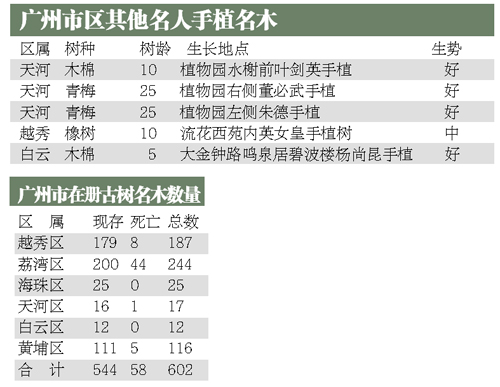華南農業大學風景園林城市規劃系主任、教授李敏表示,廣州市內政府頒令保護的602株古樹名,近年來每年都有3~5株死亡,現存僅544株;而未頒令保護古樹的生死情況則無記載,至少約1000株,其生存條件受到更多的威脅。