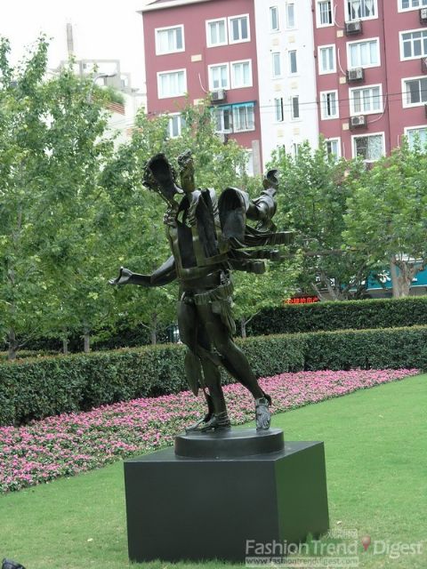 雕塑展中有不少作品大膽采用了新穎的材料與主題結(jié)合方式,完全跳出了人們的邏輯思維范圍,但視覺效果又是那么傳神入化。一座體態(tài)高大卻又輕盈通透的“風(fēng)向車”正在靜安雕塑公園石門路主入口處轉(zhuǎn)動。這是世界級藝術(shù)大師法國雕塑家菲利普·伊其理以中國剪紙手法,把厚厚的鋼板“剪裁”出形態(tài),再著黑色氟碳漆而成。它是一座可體現(xiàn)藝術(shù)“風(fēng)向”的城市雕塑,同時(shí)還是一座“社會風(fēng)向標(biāo)”——指示出東方與西方、古老與現(xiàn)代融合的某種趨勢和途徑。