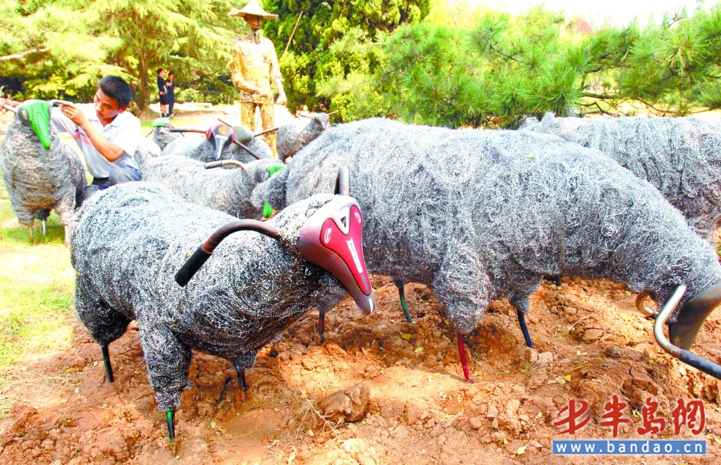 臨沂園的建設讓人眼前一亮。在一片人造的沂蒙山上,一名“牧羊人”正趕著一群“羊”,行走在回家的路上!把蛉骸惫灿15只“羊”,全都是用廢舊的自行車固件、鋼絲球等制成。臨沂園取名為“歸”,既是呼喚人們回歸自然、回歸原野,又倡導對廢舊材料回收利用。