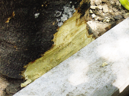 昨日上午,小橋街道路一側已鋪上了石條,走近一看,與石條緊挨著的樹干底部已被剜掉四分之一,樹皮直接裸露在外,同一路段共有七八棵綠化樹不同程度被剜。