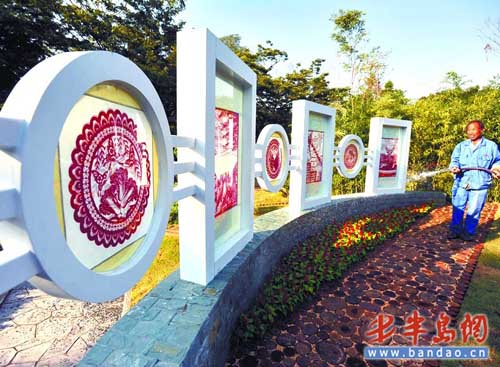 濰坊園區內豎立著幾根塑料柱子和一個“風箏 ”的中心雕塑。塑料柱子的“枝頭”上生長著一些植物,塑料柱內填充的并不是土壤,而是一些用來栽培植物的營養液,這就是濰坊壽光有名的無土栽培技術。另外,濰坊園里還展現了傳統的剪紙藝術。