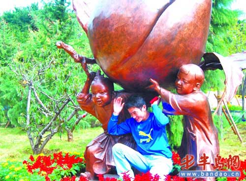 泰安園著重展現的主題之一是著名的肥城桃。在園區內有一座“肥子獻桃”的雕塑格外吸引人,雕塑上兩個孩童用力扛著一個碩大的肥城桃。園內還種植了許多真實的桃樹,這些桃樹全部從肥城桃的原產地肥城運來。