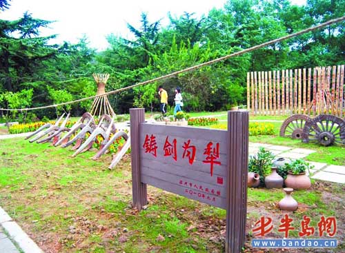 園區內一個由36塊竹簡打造的主題雕塑,上面記載著孫武的“三十六計”。而選用廢舊的磨盤石為材料鋪裝的地面,表層刻有象棋棋局,代表了攻守自如的兵法神力。