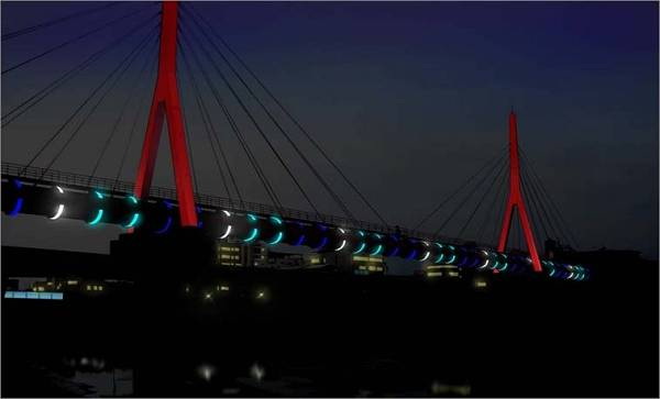 ▲水管橋會呼應列車行進方向,具有追光的互動光演效果,無列車通過時,也將呈現顏色轉換效果。