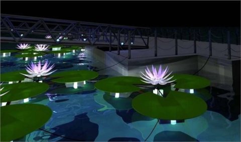 ▲大佳碼頭透過串接一系列睡蓮意象的浮動光雕,在碼頭近岸塑造出一片浮水蓮花群落景致。