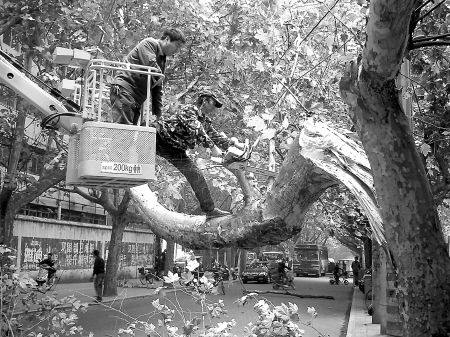 正在現(xiàn)場指揮善后處理工作的園林綠化隊康主任說:“現(xiàn)在得把已經(jīng)斷裂的樹枝鋸掉,再把較高的樹枝剪斷,以保證這棵樹的平衡和存活。”康主任指著東邊20米遠處的一棵樹說道:“兩周前,這棵樹也是被渣土車撞斷的。”