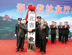 全國綠化委員會副主任、國家森林防火指揮部總指揮、國家林業(yè)局局長賈治邦,湖北省委書記、省人大常委會主任羅清泉,省委常委張昌爾,省委常委、省委秘書長李春明,省人大常委會副主任羅輝,副省長趙斌,省政協(xié)副主席鄭心穗出席揭牌儀式。李春明宣讀了省編委關(guān)于將湖北省林業(yè)局更名為湖北省林業(yè)廳并調(diào)整為省政府組成部門的通知,趙斌主持揭牌儀式。