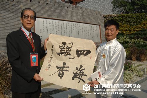 丁錫鏞表示,“西安的院子”將傳統與現代相結合,表現出西安的歷史之墻、人文之墻、生態之墻,是一種非常好的表現方式。臺灣對“西安的院子”有一種非常強烈的親近感覺,尤其是從西安來的“輕描淡寫”書寫者現場揮毫,給他留下了深刻的印象。書寫者遒勁有力的筆法博得丁錫鏞和現場游客陣陣掌聲,“輕描淡寫”書寫者王和平將“四海飄香”書法作品現場贈送給丁錫鏞。